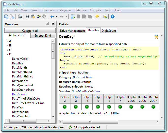 The database can be searched for snippets that contain specified text, for cross referenced snippets. The snippets to be displayed can also be selected manually. In addition you can search for Pascal snippets that compile under given versions of Delphi or Free Pascal.