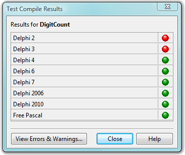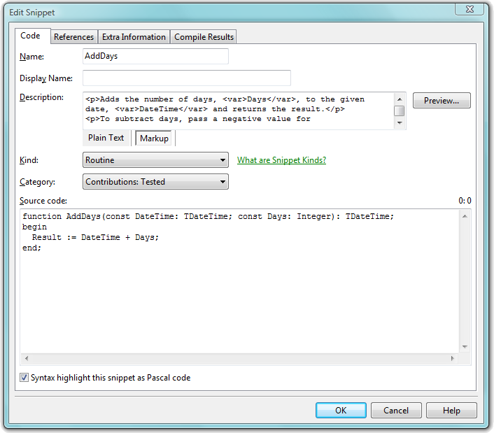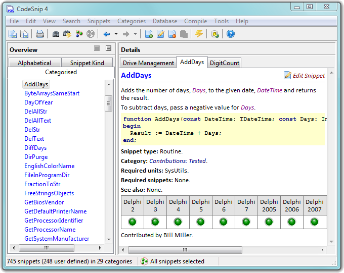 Designed with Pascal code in mind, CodeSnip enables Delphi or Free Pascal code snippets to be test-compiled with any installed Delphi or Free Pascal compiler and results to be reported. Use this feature to validate the syntax of code without switching to your compiler. Compilable Pascal units containing selected snippets can be generated.