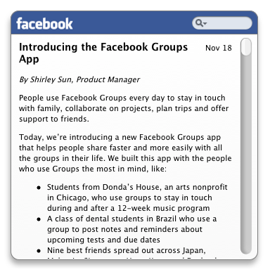 Get Facebook news, updates or tips right from your Mac OS X Dashboard.