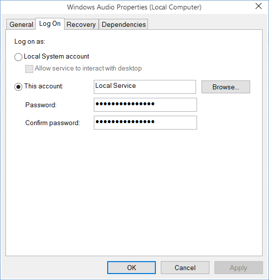 Audiosrvto read it.No. Please don't. This is NOT a good idea. Messing with service user accounts is not only going to compromise the security of your system, it will also create a serious mess with various unintended side effects that could break various things and will likely make things worse. Leave the Windows Audio service configuration as it is.
