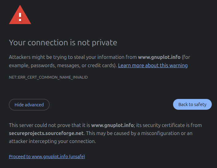 On Wed, Sep 10, 2025 at 11:35 AM Juhász Péter <pet...@gm...> wrote: > On Wed, 2025-09-10 at 10: 51 -0700, Ethan A Merritt wrote: To the limited > extent that I understand the error messages that I am seeing, it is not a > matter of appropriate content on the server. The query is never getting to > the server because > ZjQcmQRYFpfptBannerStart > On Wed, 2025-09-10 at 10:51 -0700, Ethan A Merritt wrote: > > To the limited extent that I understand the error messages that I am > seeing, > it is not a matter of appropriate content on the server. The query is > never > getting to the server because some intermediate service provider is > failing to > deliver it. If I am misunderstanding and there is some configuration > thing I > can change on the SourceForge end, please let me know. > > > Hi, > > you've mentioned that the actual content is hosted on/by SourceForge. > > Under what kind of formal or informal arrangement or contract does this > happen? Was any payment involved > No payment or formal contract with SourceForge that I know of. The error message means that the certificate required to serve the site > over HTTPS is not valid for the domain name gnuplot.info (nor > www.gnuplot.info > <https://urldefense.com/v3/__http://www.gnuplot.info__;!!K-Hz7m0Vt54!hZAtTCSEA3UZsTRDYd1Rlg-J8_Oq7DJZg-cJMaMoMBMcyZx3lwvCVqHE401p-ZikRUWZruc71FaDNhZkYYE3tw4$>). > If you look at the certificate (offered by Firefox next to the error > message), you can see that it was issued by Let's Encrypt to > secureprojects.sourceforge.net, and it is valid for a large selection of > other domain names, presumably all projects hosted by SF. > Thank you for your insights. I think you are addressing a different issue - whether the connection protocol is https or http. It is not surprising that a certificate issued to SourceForge would not mention gnuplot.info by name because that name is not connected to SourceForge except in that (as I understand it) it currently redirects queries to the actual gnuplot site gnuplot.sourceforge.net. The current problem seems to be that the redirection itself fails in some cases, or fails to pass through sufficient information (or credentials or something - I really really don't understand this stuff). If you are seeing an error message that refers to a SourceForge certificate then I think in your case the redirection must have succeeded. You still see the site, correct? It's just that connection is falling back to http rather that https. I was getting an error from some intermediary network entity (Cloudflare) that reports "DNS resolution error 1001". As Hans-Bernhard noted, that's rather odd because DNS does seem to work correctly when tested by command line tools. For completeness I should mention that the issue of connection via IPv6 as opposed to IPv4 was raised earlier, and might be relevant, but that goes way beyond my level of understanding. Ethan > So the person who is responsible for renewing this certificate at SF > either made a mistake by not including gnuplot.info (and in this case a > gentle reminder may fix the issue in October at the very latest, possibly > earlier), or deliberately removed gnuplot.info from the list of domains, > because the afore-hypothesized contract has expired (in which case the > gentle reminder may have to include money). > > As to whom that gentle reminder should be sent, I have no idea. > best regards, > > Peter Juhasz > |