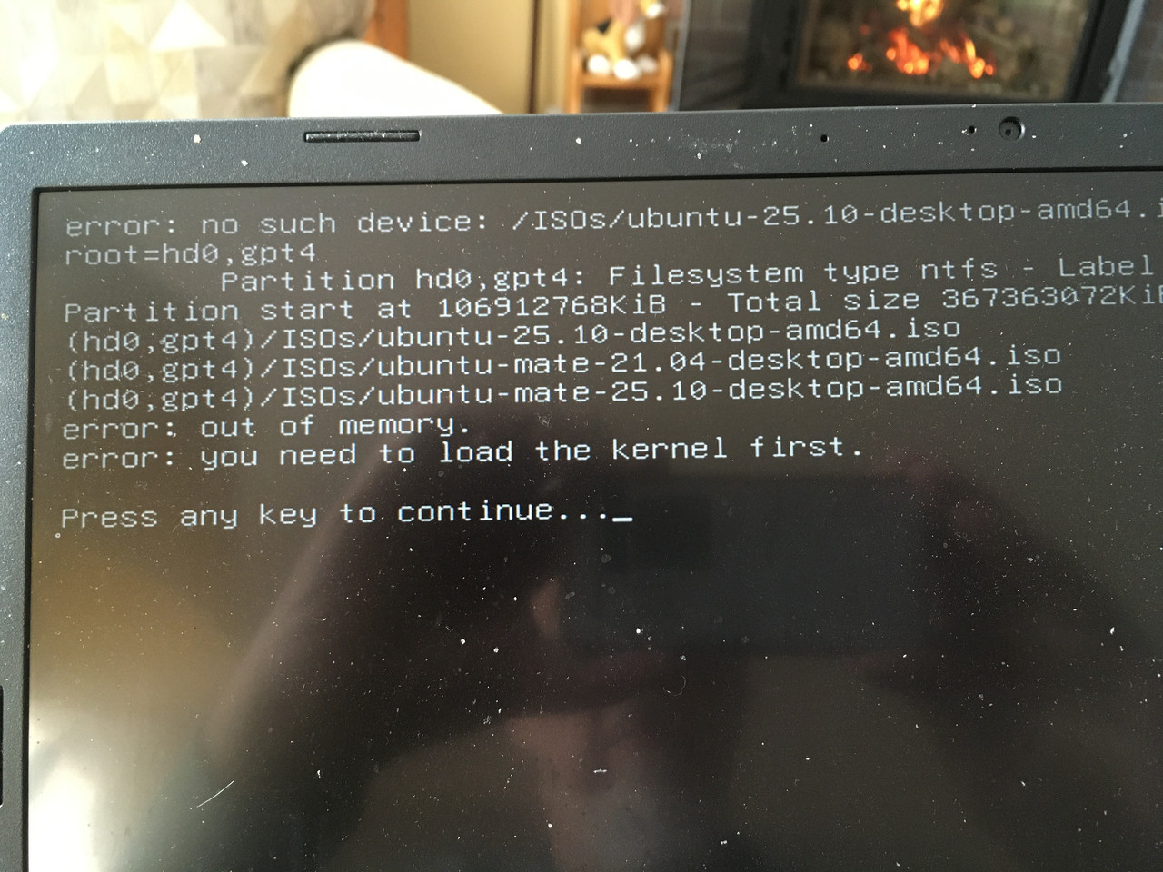 # search -f $iso --set=root set root='(hd0,gpt4)' insmod part_gpt # echo root=$root # ls ($root) # ls ($root)/ISOs/ubuntu* loopback loop $iso echo Booting $iso linux (loop)/casper/vmlinuz $bootparms initrd (loop)/casper/initrd }