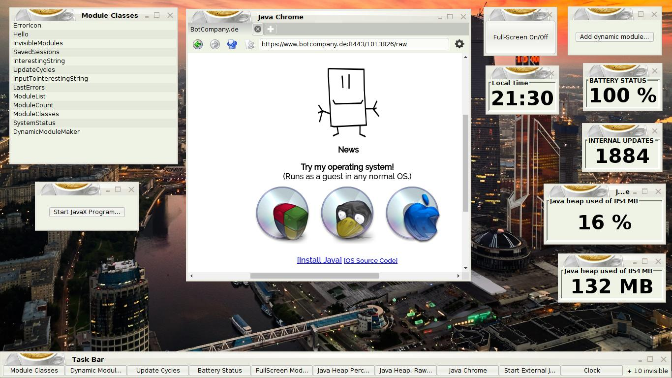 Hey folks. I'm one of the core developers of the original JOS project. I'm doing it again. This time it's real. Computers have advanced, Java native libraries have advanced (we can now embed Chrome and VLC into Java windows), Java has advanced (I made a dialect of it with important improvements called "JavaX"), and the JVM has advanced into stability & speed. Also, Microsoft is strongly out of favor these days, so it is TIME FOR A NEW OPERATING SYSTEM! My Java OS WORKS RIGHT NOW as a guest inside Windows, Linux or Mac OS. Link: http://BotCompany.de Screenshot: https://botcompany.de/1004590/raw/1101306 Testers & devs wanted NOW!! All the best, Stefan -- Stefan Reich BotCompany.de |