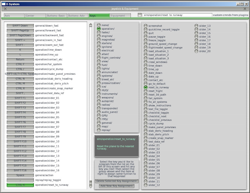 When you start X-Plane for the first time, i recommend setting up a hotkey to reset your aircraft to the runway. This will come in handy when you need the plane sitting still on the ground in order to reinitialize the UDB, without having to navigate the menus. Go to the "Settings" menu, and select "Joystick, Keys & Equipment". Select the "Keys" tab. Click on the "Add New Key Assignment" button. Select the new item labeled <NONE> at the bottom of the key assignment list. Press the key combo you would like to assign, in my case i used CTRL + R. In the middle pane select the "operation/" radio button, and then in the right hand pane, select "reset_to_runway". Your screen should look like the one below.