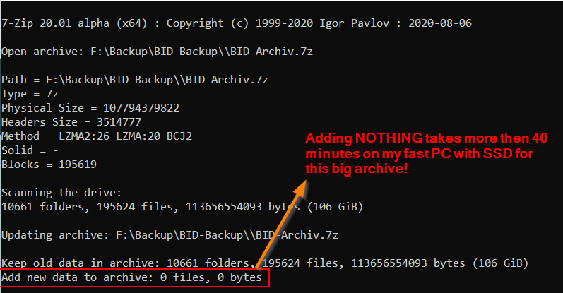 I'm not sure if this is a new v20.01 issue, but adding NOTHING to a big archive takes forever... (instead of the expected time for checking and displaying "Add new data to archive: 0 files, 0 bytes")