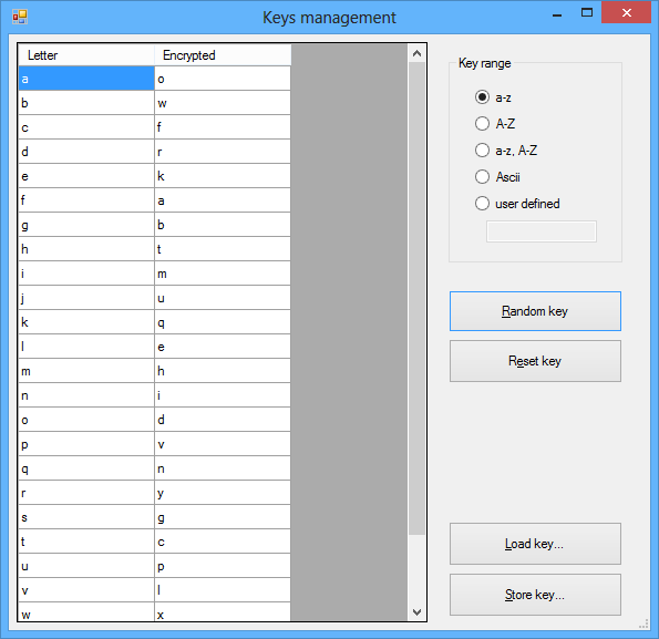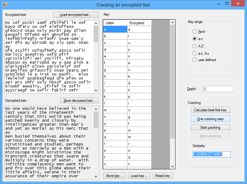 With this substitution cipher toolkit you can encrypt and decrypt texts with substitution cipher. You can also gather language statistics with which you can crack encrypted text automatically. But you can also try to decrypt text yourself.