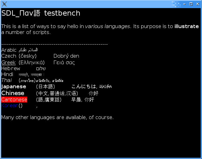 How disturbing that Korean comes up blank... =P -Mark On Tue, 27 Dec 2005, Bill Kendrick wrote: > > FYI, thanks to someone's note in one of the bugs at SourceForge, > I've discovered "SDL_Pango," an SDL front-end to GNOME 2.x's Pango text > rendering engine: > > http://sdlpango.sourceforge.net/ > > > It is NOT currently packaged for Debian Unstable ('sid'), and seems to > be a relatively unknown project, based on how few SF.net file > downloads there have been. So, I've compiled it from source and installed > it on my system at home. Here's a screenshot of the test app that's > included: > > http://www.sonic.net/~nbs/sdl_pango.png > > Eventually we'll need to use this to handle some more complicated > scripts, such as Arabic, I think. > > I don't think this helps the problem we have with non-ASCII entry into the > "Text" tool in Tux Paint, though. Any ideas for that? > > -- > -bill! > bi...@ne... > http://www.newbreedsoftware.com/ > > > ------------------------------------------------------- > This SF.net email is sponsored by: Splunk Inc. Do you grep through log files > for problems? Stop! Download the new AJAX search engine that makes > searching your log files as easy as surfing the web. DOWNLOAD SPLUNK! > http://ads.osdn.com/?ad_id=7637&alloc_id=16865&op=click > _______________________________________________ > Tuxpaint-i18n mailing list > Tux...@li... > https://lists.sourceforge.net/lists/listinfo/tuxpaint-i18n > -- Mark K. Kim AIM: markus kimius Homepage: http://www.cbreak.org/ Xanga: http://www.xanga.com/vindaci Cyworld: http://www.cyworld.com/markuskimius <-- NEW! Friendster: http://www.friendster.com/user.php?uid=13046 PGP key fingerprint: 7324 BACA 53AD E504 A76E 5167 6822 94F0 F298 5DCE PGP key available on the homepage |