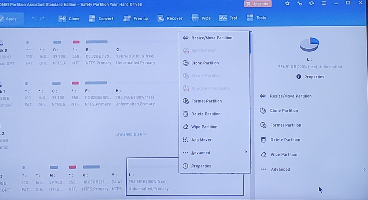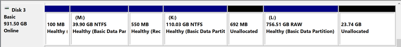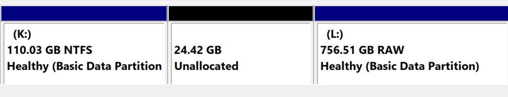 Disk management image. Unallocated space to the left of the encrypted L:\ partition