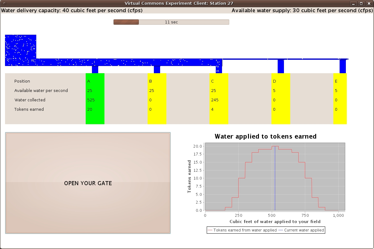 1 new commit in irrigation: https://bitbucket.org/virtualcommons/irrigation/commits/0554cc0a290b/ Changeset: 0554cc0a290b User: alllee Date: 2014-05-17 10:17:42 Summary: adding demo configuration Affected #: 24 files diff -r 05f8ba36a3a3426649c859aa8f2c20f90093a939 -r 0554cc0a290b3838e5156425a29d5852db54e257 src/main/resources/configuration/demo/README.txt --- /dev/null +++ b/src/main/resources/configuration/demo/README.txt @@ -0,0 +1,1 @@ +Demo irrigation treatment with full vision and high variable shocks to infrastructure in the last 10 rounds diff -r 05f8ba36a3a3426649c859aa8f2c20f90093a939 -r 0554cc0a290b3838e5156425a29d5852db54e257 src/main/resources/configuration/demo/irrigation.xml --- /dev/null +++ b/src/main/resources/configuration/demo/irrigation.xml @@ -0,0 +1,641 @@ +<?xml version="1.0" encoding="UTF-8"?> +<!DOCTYPE properties SYSTEM "http://java.sun.com/dtd/properties.dtd"> +<properties> +<comment>Irrigation experiment server configuration</comment> +<entry key="hostname">@SERVER_ADDRESS@</entry> +<entry key="port">@PORT_NUMBER@</entry> +<entry key="number-of-rounds">22</entry> +<entry key="round0">round0.xml</entry> +<entry key="round1">round1.xml</entry> +<entry key="round2">round2.xml</entry> +<entry key="round3">round3.xml</entry> +<entry key="round4">round4.xml</entry> +<entry key="round5">round5.xml</entry> +<entry key="round6">round6.xml</entry> +<entry key="round7">round7.xml</entry> +<entry key="round8">round8.xml</entry> +<entry key="round9">round9.xml</entry> +<entry key="round10">round10.xml</entry> +<entry key="round11">round11.xml</entry> +<entry key="round12">round12.xml</entry> +<entry key="round13">round13.xml</entry> +<entry key="round14">round14.xml</entry> +<entry key="round15">round15.xml</entry> +<entry key="round16">round16.xml</entry> +<entry key="round17">round17.xml</entry> +<entry key="round18">round18.xml</entry> +<entry key="round19">round19.xml</entry> +<entry key="round20">round20.xml</entry> +<entry key="round21">round21.xml</entry> + +<entry key="wait-for-participants">true</entry> +<entry key='chat-duration'>20</entry> +<entry key='round-duration'>50</entry> +<entry key='field-of-vision'>0</entry> + +<entry key="q1">49</entry> +<entry key="a1">49%</entry> +<entry key="explanation1">An existing infrastructure efficiency of 20% + 29 tokens invested = 49% infrastructure efficiency.</entry> +<entry key="q2">5</entry> +<entry key="a2">5 cubic feet per second</entry> +<entry key="explanation2"> +<![CDATA[ +An existing infrastructure efficiency of 35% + 15 tokens invested = 50% infrastructure efficiency for the current round. +An infrastructure efficiency of 50% corresponds to a water delivery capacity of 5 cubic feet per second. +]]> +</entry> +<entry key="q3">5</entry> +<entry key='a3'>5 cubic feet per second</entry> +<entry key="explanation3">Since there is only 30 cubic feet per second of water +available, the irrigation infrastructure capacity of 35 cubic feet per +second will not be fully used. When A opens their gate, they take 25 of the +30 cubic feet per second out of the canal, leaving 5 cubic feet per second for +B. +</entry> +<entry key="q4">25</entry> +<entry key="a4">25 cubic feet per second</entry> +<entry key="explanation4">If A has 25 cfps available and does not take any +water, the same amount is available for the people downstream. Since B, C and +D do not take water, 25 cfps is available for E.</entry> +<entry key="q5">7</entry> +<entry key="a5">7 tokens</entry> +<entry key="explanation5">If you invest 7 out of 10 tokens, you keep 3 tokens for yourself. If you apply 202 cubic feet of water to your field you will earn 4 tokens. 3 + 4 = 7 tokens </entry> +<entry key="q6">19</entry> +<entry key="a6">19 tokens</entry> +<entry key="explanation6">If you invest all 10 tokens, you keep 0 tokens from +your initial endowment. If you apply 555 cubic feet of water to your field +you will earn 19 tokens. 0 + 19 = 19 tokens.</entry> + +<entry key='final-instructions'> +<![CDATA[ +<p> +The experiment is almost over. We have a brief survey for you to fill out while the +facilitator prepares your payments. When the facilitator has finished preparing +payments and you have all completed your surveys your computer number will be +called. You can then go next door to receive your payment. For privacy reasons we +must pay you one at a time. +</p> +<p> +Thanks for participating! +</p> +]]> +</entry> + +<entry key="initial-instructions"> +<![CDATA[ +<h1>Instructions</h1> +<hr> +<p> +You have already earned {showUpPayment} by showing up for this exercise. You +can earn more, up to a maximum of about {maximumPayment}, by participating in this +experiment which will take about an hour to an hour and a half. The amount of money +you earn depends on your decisions AND the decisions of other people in this room +over the course of the experiment. +</p> +<h2>Groups</h2> +<hr> +You will be participating in this exercise as a part of a group of +{self.clientsPerGroup} participants. Your group has been formed by randomly +selecting you and four other participants in the room. +</p> +<h2>How to participate</h2> +<hr> +<p> +This exercise mimics decisions people make in irrigation systems. In each round you will receive {self.tokenEndowment} +tokens. You can choose to invest in the irrigation infrastructure or keep the tokens. Based on the <b>water delivery +capacity</b> of the irrigation infrastructure and the availability of water you will be able to grow crops. The total +number of tokens you can earn in a round is the sum of your tokens not invested plus the tokens you earn from growing +crops. Each token is worth {dollarsPerToken}. In each round you will first decide how much to invest in the irrigation +infrastructure. Based on the combined contributions of all 5 participants in your group in each round, your group can +maintain the capacity of the irrigation infrastructure for growing crops. +</p> + +<p> +We will now start a practice round to help illustra