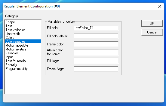 expr-*-color- that always reference variables, are used when one adds variable names to this dialog in CoDeSys Element Configuration - Colorvariables:We only implemented the "Fill Color" variable for now, as this currently suffices.