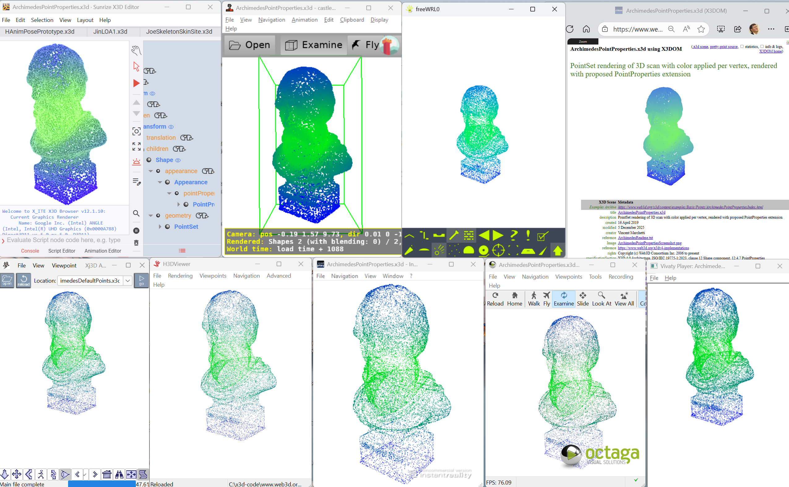 It occurred to me that you can pick up data files here: https://coderextreme.net/X3DJSONLD/src/main/data/ Mouse over a link to get the filename, I think. I know it’s clunky. Thanks, John On Thu, Aug 7, 2025 at 7:59 PM John Carlson <yot...@gm...> wrote: > Please look at these examples on > https://coderextreme.net/X3DJSONLD/src/main/html/main_viewer.html under > NavigationInfo type menu at right. There’s a difference between X3DOM and > X_ITE, but I don’t know which is correct yet. If needed, I can track down > the .x3d files. They’re in this folder which is huge: > https://github.com/coderextreme/X3DJSONLD/tree/master/src/main/data > > - > - indexedfaceset_pixeltexture_entire.json > - indexedfaceset_pixeltexture_part.json > - indexedfaceset_pixeltexture_plus.json > - indexedfaceset_pixeltexture_whole.json > > > Thanks, > > John > > P.S.: if all else fails, I will attach them. > |