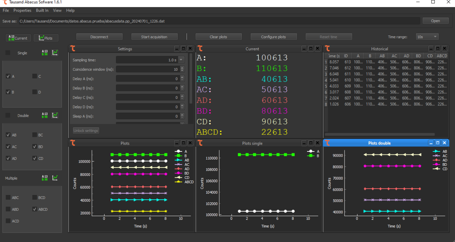Abacus Software is a specialized tool for controlling and analyzing Tausand Abacus devices (AB1002, AB1004, AB1502, AB1504, AB2502, and AB2504). It enables precise measurement of temporal coincidences with up to 2-nanosecond resolution, and real-time visualization of count data from one, two, or three channels simultaneously. The software includes advanced features such as adjustable line width, sampling time configuration, direct device settings control, and the ability to save both raw data and graphical outputs for later analysis. Designed for researchers, engineers, and educators, Abacus Software provides a user-friendly interface and powerful visualization tools to support high-resolution timing analysis in experimental setups.