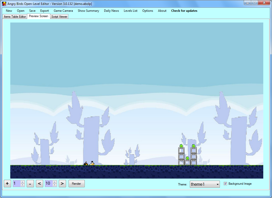 Create, edit and share your own levels with Angry Birds Open-Level Editor! Select any items and characters as you want and add it to your level screen. Then export it to a file and play it in the game or share it to your friends!