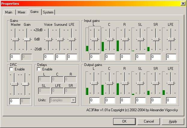 It is DirectShow AC3 Decoder filter used to palyback AVI files with AC3 sound tracks and DVDs. Multichannel and S/PDIF support. Focused at flexible controls during playback: gains, mixer, stream information, levels and other.