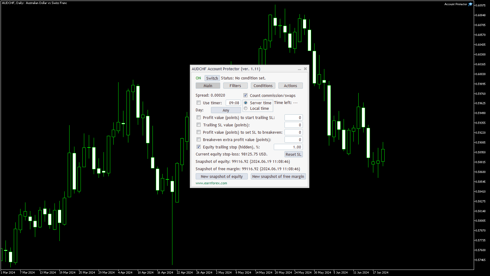 Account Protector is a MetaTrader expert advisor that allows you to define a range of conditions (for example, total loss exceeding some percentage of your account) and a list of actions (for example, close all trades) that will be executed when one of those conditions is triggered.