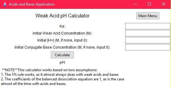 The Acids and Bases chapters' (14 and 15) calculations are arguably the hardest calculations in all of AP Chemistry. With some problems taking as long as ten minutes to solve, the can be hard to wrap the mind around. However, with the Acids and Bases Program, a quick answer is never more than a click away.