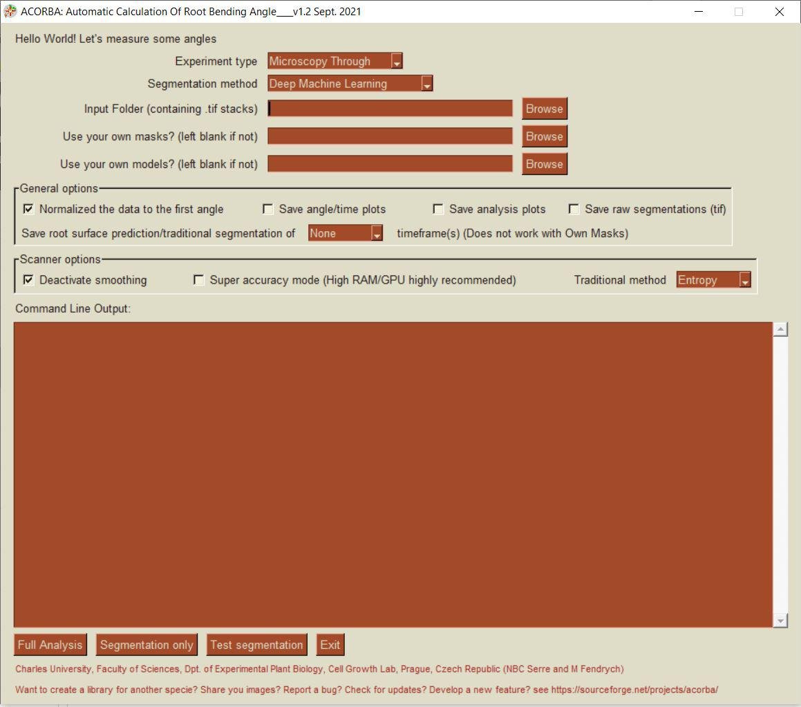 Gravitropic response is studied in most of the laboratories working with Arabidopsis thaliana, for example, to detect new phenotypes in mutants. However, manual analysis of images and microscopy data are known to be subjected to human bias. This is particularly the case for manual measurements of root bending as the angle is set subjectively. In this context, it is essential to develop and use automated or semi-automated image analysis to produce faster, reproducible, and unbiased data. In this context, we developped ACORBA (Automatic Calculation Of Root Bending Angles), a fully automated software to measure root bending angle over time.