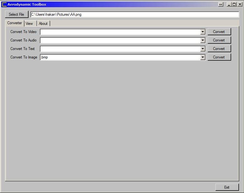 Aerodynamic Toolbox is a software that you can view video and audio files. The special part, you can convert to these formats. VIDEO: .mp4 .avi .wmv .flv AUDIO: .mp3 .m4a .wav PICTURE: .png .jpg .gif .bmp TEXT: .txt .html .php