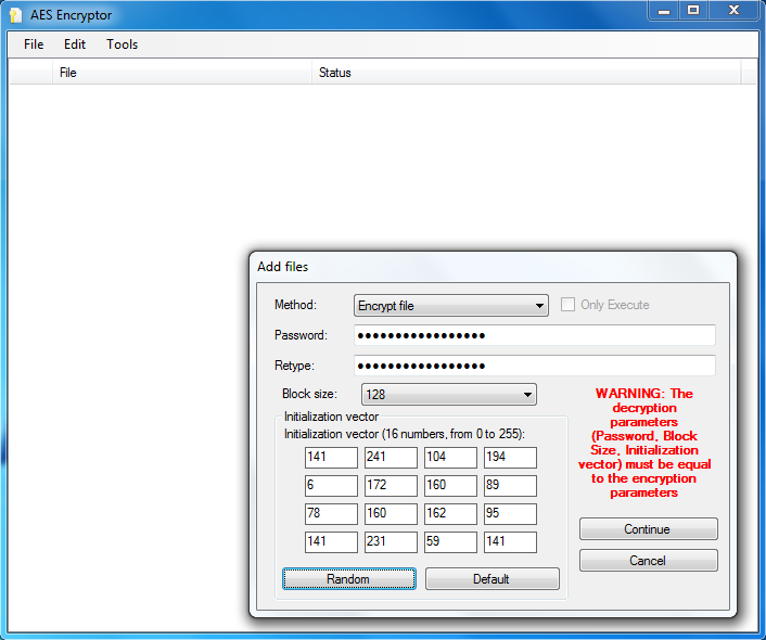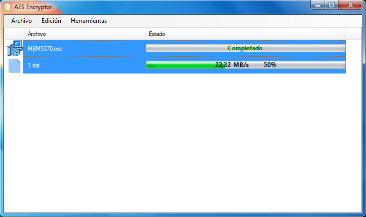 AESEncryptor is a fast and simple utility to protect your files with the Advanced Encryptation Standard algorithm. It is safer than zip or rar files because a simple force-attack can reveal their password. A force-attack to an AES encriptation could delay millions of years. There are available the source code of the GUI, a CaptionProgressBar and the RijndaelCryptorProvider, the core of the application which can start a encriptation process in a simple code line.