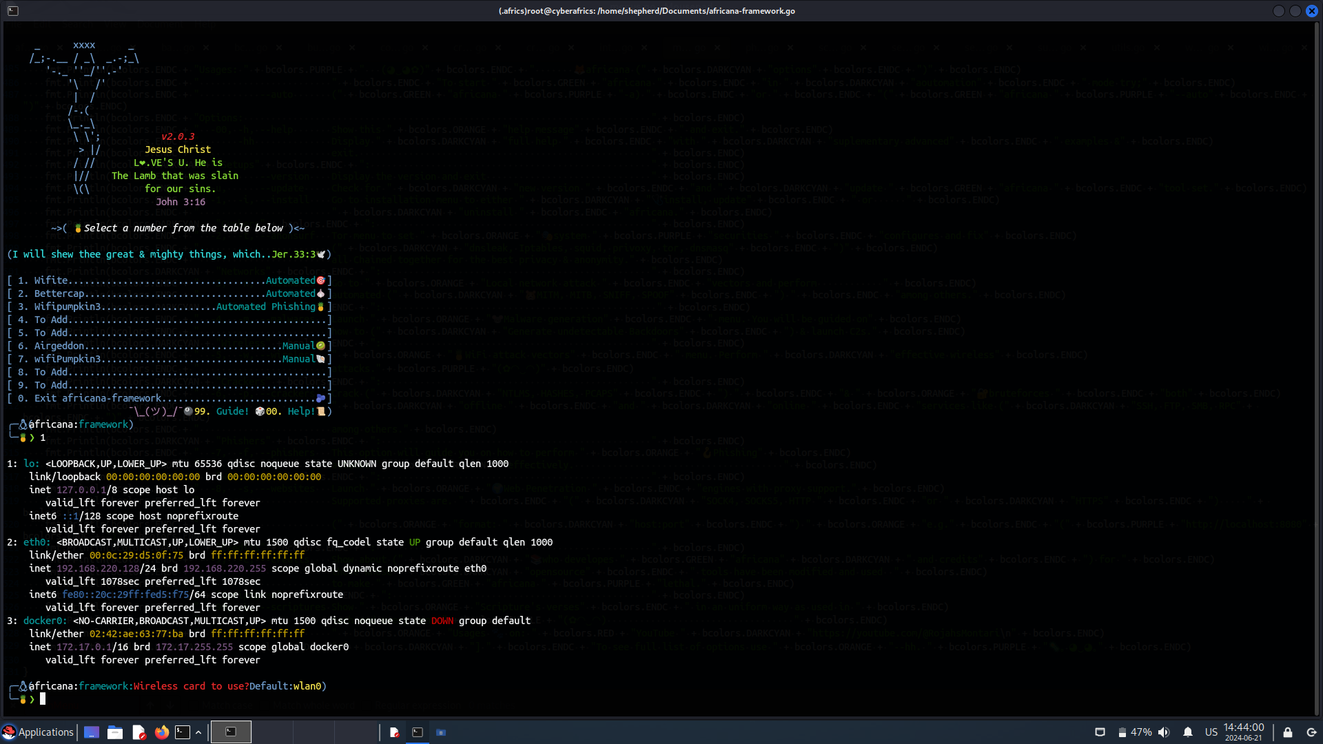 The africana-framework is a software designed for network & web hacking by automating as much stuff as possible to detect vulnerabilities on most common services and web technologies. It also has some wide range of penetration testing from internal network, WIFI, system anonymity to web bug hunting. It's purely written for Good and not Evil