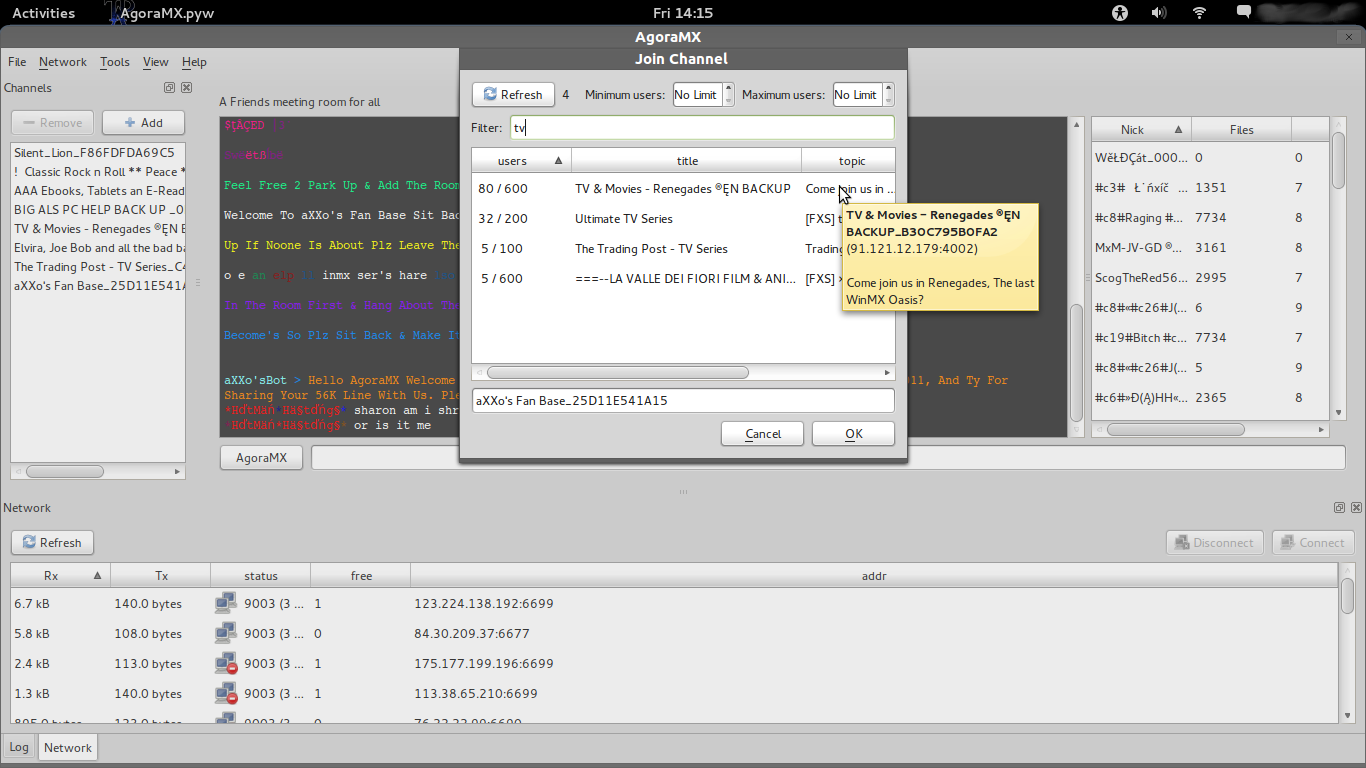 AgoraMX is a decentralised chat and file sharing client intended for use in support of the activities at http://theagoraproject.org