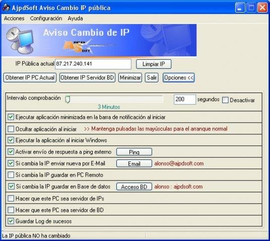 Gets the PC public IP admits the possibility of sending it by email, by socket connection or to a remote server with MySQL Database runing (save the IP in a MySQL database (version from 3.20 to 4.1) for remote consult).