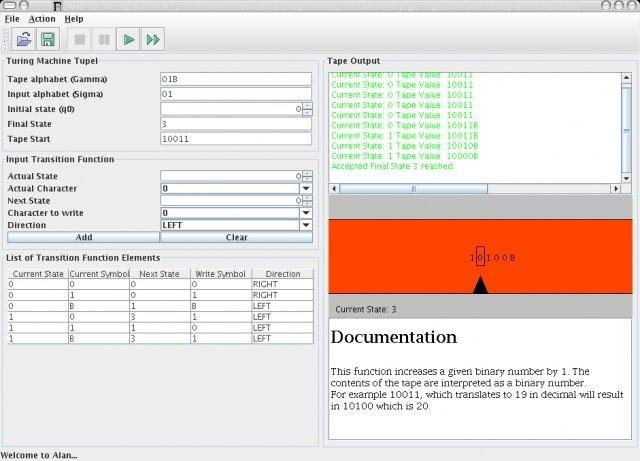 Alan is a Java Implenmentation of a Turing Machine for educational purpose. Features include: - Easy to use GUI - Many example Programs - ReUsable Turing Machine Component