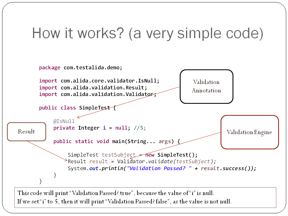 - It is packaged as a jar file (alida.jar) which can be dropped in the classpath and used. It can also be configured with eclipse’s annotation processing to give complier errors and warnings at the time of usage.