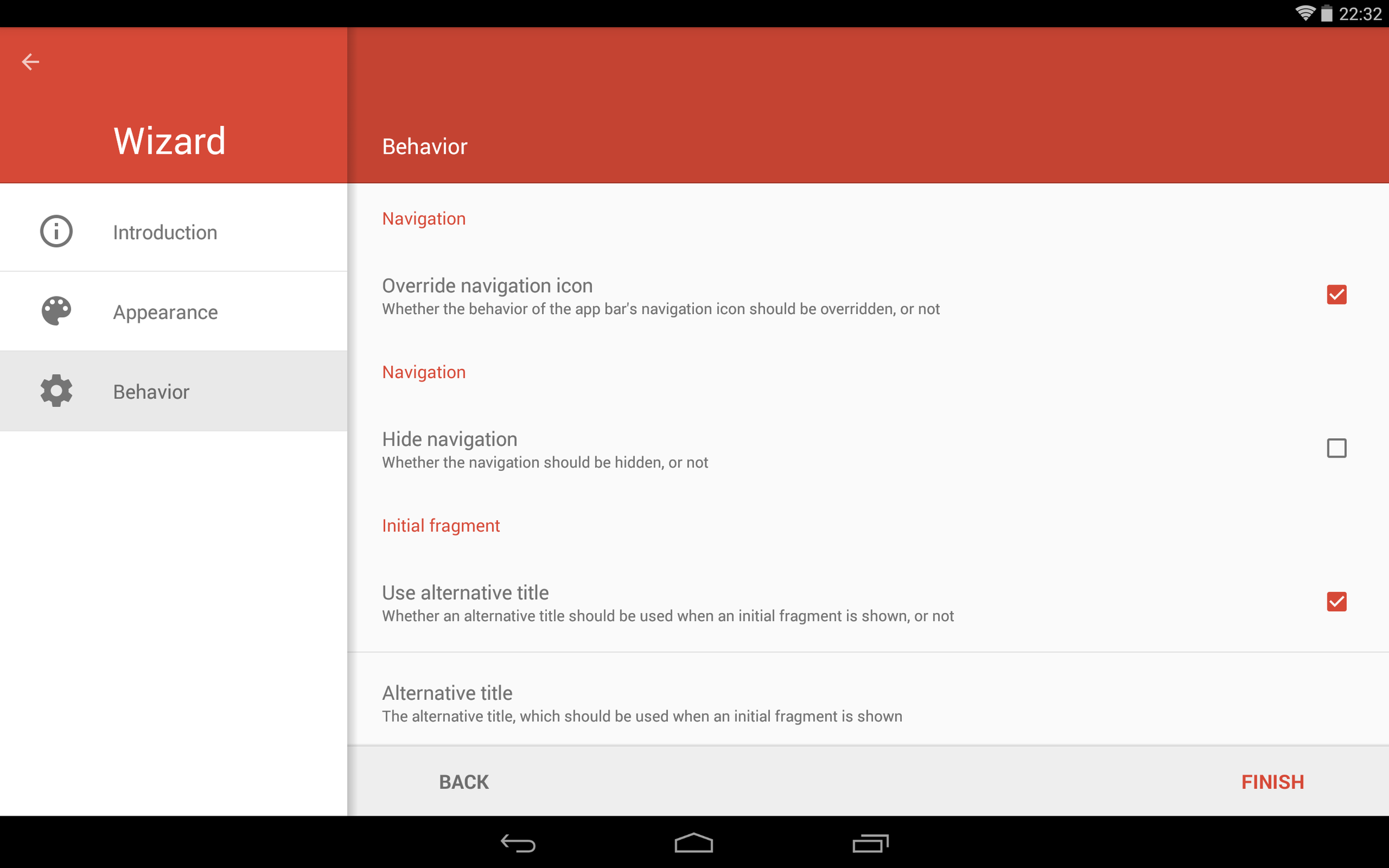 - By specifying appropriate intent extras, it is also possible to use the activity as a wizard, which provides an alternative navigation, which allows to navigate from one step of the wizard to an other. The navigation can be observed and influenced by implementing and registering an appropriate listener.