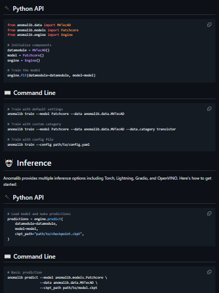Anomalib is an open-source deep learning library focused on anomaly detection and localization tasks, collecting state-of-the-art algorithms and tools under one modular framework. It provides implementations of leading anomaly detection methods drawn from current research, as well as a full set of utilities for training, evaluating, benchmarking, and deploying these models on both public and private datasets. Anomalib emphasizes flexibility and reproducibility: you can use its simple APIs to plug in custom models, track experiments, tune hyperparameters, and generate visualizations that highlight anomalous regions. Its design supports unsupervised or semi-supervised paradigms, making it especially powerful for scenarios where only “normal” data is readily available and defects must be detected without exhaustive labeling. Combined with its CLI and integration with optimization tools like OpenVINO, it’s suitable for both research and edge deployment tasks.