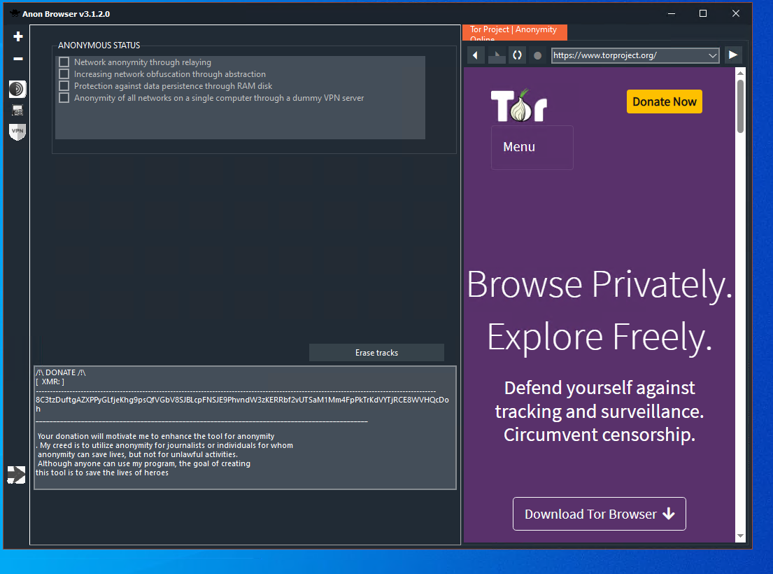 Extended Connection Capabilities This tool goes beyond a simple anonymous browser, offering functionality that allows other programs, such as RDP, FTP, and SSH, to use an anonymous channel for connections. This expands its usability, providing flexible solutions for various tasks requiring a high degree of anonymity. Advantages: Three-tier security system: The use of Tor, VPN, and data obfuscation creates a robust barrier for user data protection. This complex combination of technologies makes tracking user activities considerably more challenging. RAM Disk: All user activity is redirected to a RAM disk, ensuring high operational speed and guaranteeing that no data remains after the computer is rebooted. This ensures 100% deletion of all traces of use.