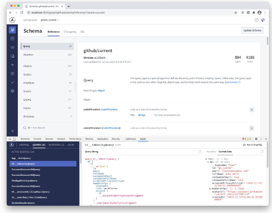 This repository contains the Apollo Client Browser Devtools extension for Chrome & Firefox. The Apollo Client Browser Devtools appears as an "Apollo" tab in your web browser inspector, alongside other tabs like "Elements" and "Console". Send queries to your server through your web applications configured Apollo Client instance, or query the Apollo Client cache to see what data is loaded. View active queries, variables, cached results, and re-run individual queries. View fired mutations, and variables, and re-run individual mutations. Visualize the Apollo Client cache and search through it by field names and/or values. You can install the extension via Firefox Browser Add-ons or the Chrome Webstore. If you want to install a local version of the extension instead, skip ahead to the Developing section. While your application is in dev mode, the devtools will appear as an "Apollo" tab in your web browser inspector.