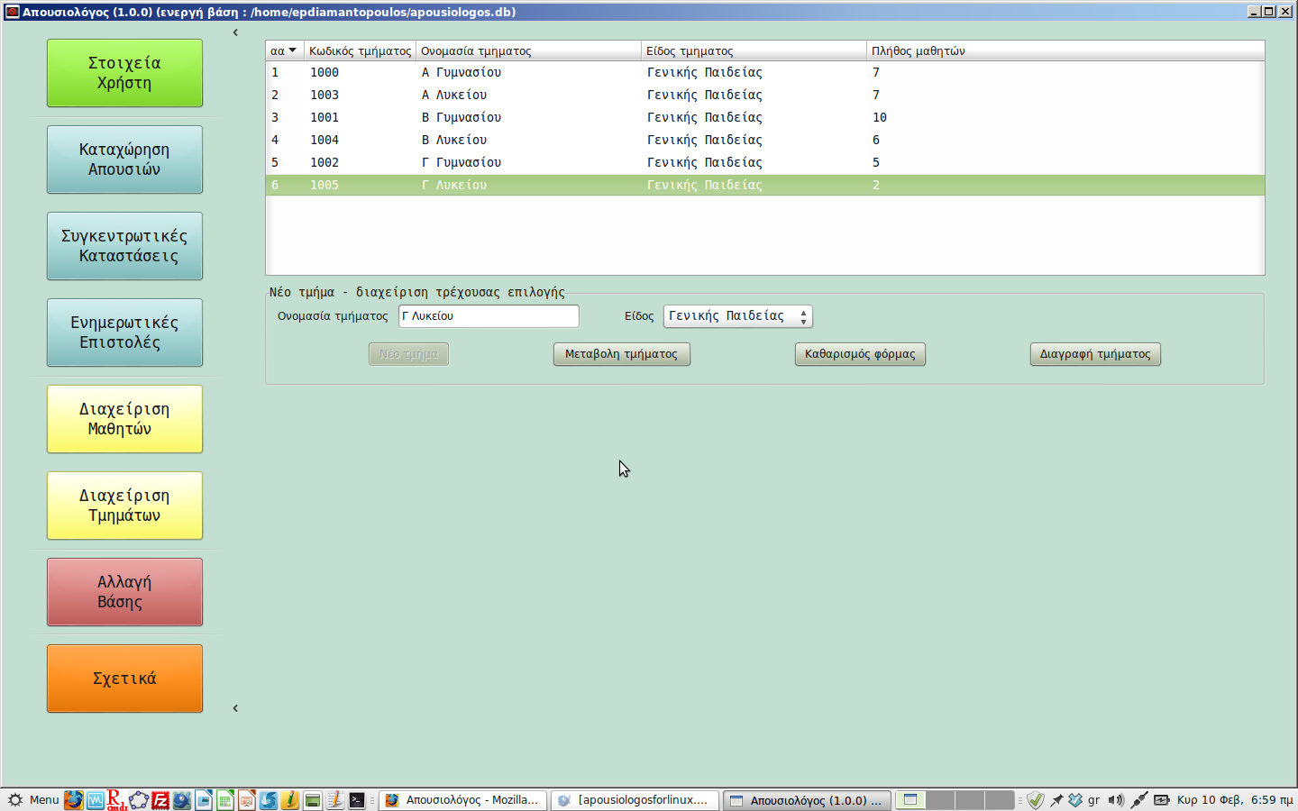 Apousiologos is an application with the purpose to make the counting for the teacher, prepare the necessary report for him/her, and export each report in html or csv form for printing or further editing if necessary.
