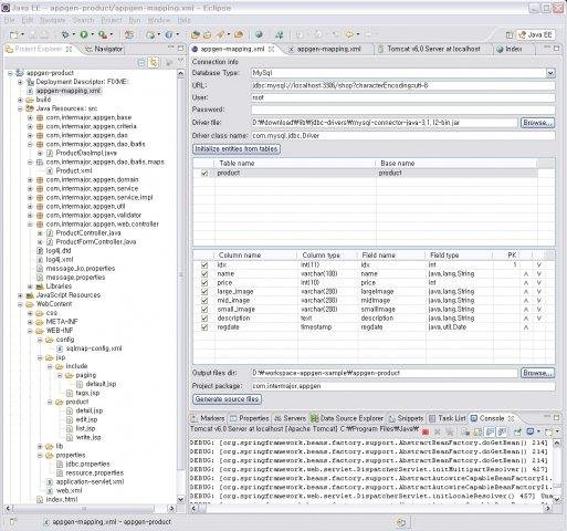AppGen eclipse plugin generate full java web application source codes based on Spring and iBatis. You can set the XML configuration mapping file from a database schema quickly by conventions, and can edit it easily. (requires java 1.5 or higher)