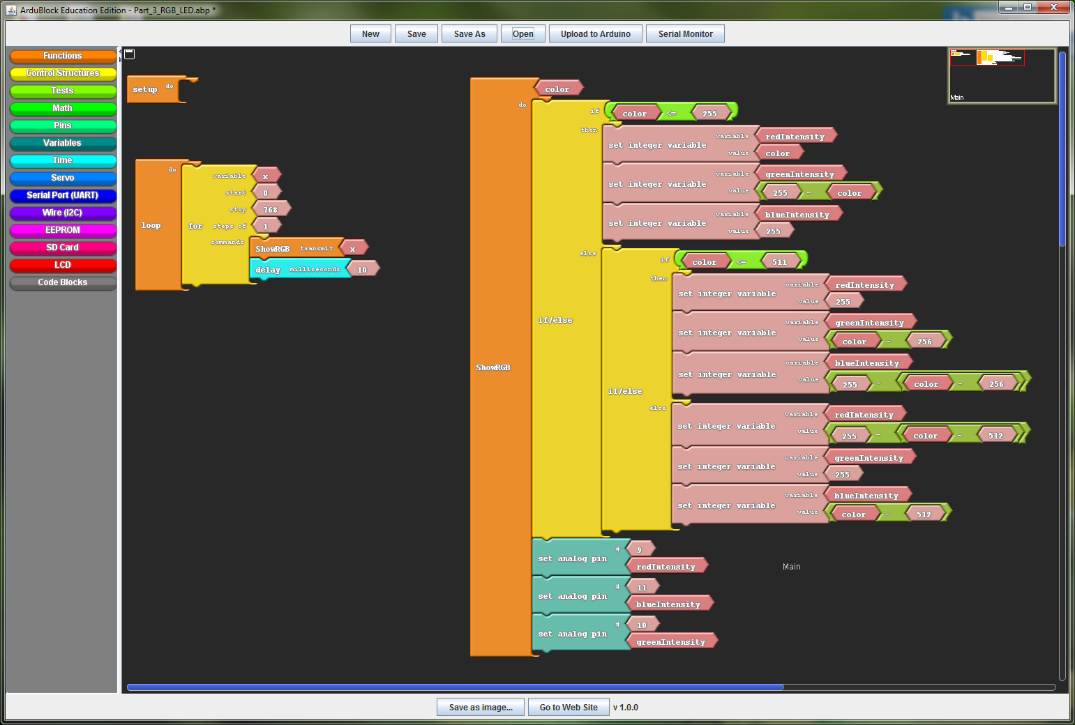- Block names match the Arduino Language Reference as much as possible. For example, the original ArduBlock had a block called "repeat"; this version has a block named "for" - this way kids will get to know the concept of a for loop.