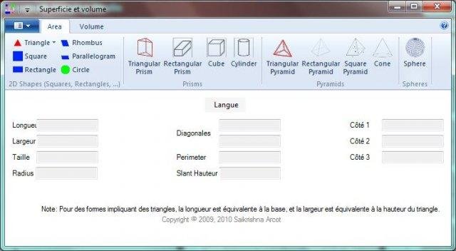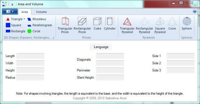 This program can calculate the area and volume for various 2D and 3D shapes such as Rectangles, Parallelograms, Prisms, Pyramids, and Spheres. To install: Download the .exe file.