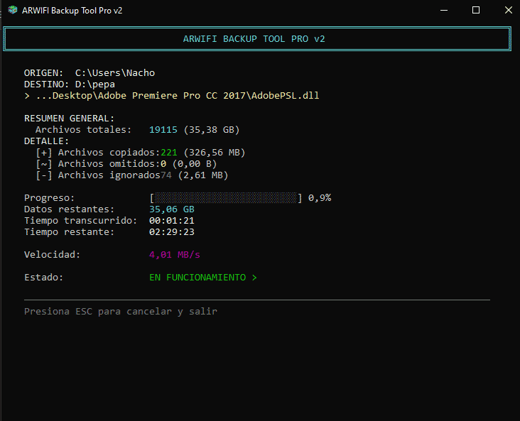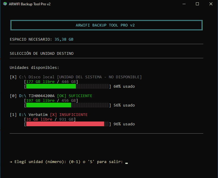 ARWIFI Backup Tool Pro v2 is a backup tool for Windows, designed to be simple, fast and visually striking. It scans your personal folders (Desktop, Documents, Downloads, Pictures, Videos), filters out temporary and cache files, and lets you choose an external drive as destination. > 100% console interface, with real-time progress bar, complete statistics and keygen/retro aesthetics.