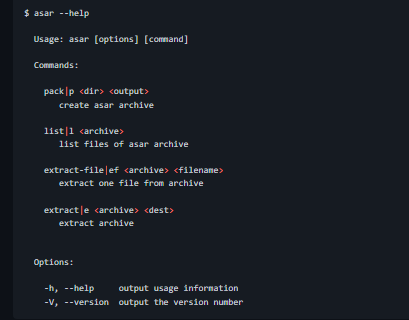 Asar is a simple extensive archive format, it works like tar that concatenates all files together without compression while having random access support. You can pass in a transform option, which is a function, that either returns nothing or a stream. Transform. The latter will be used on files that will be in the .asar file to transform them. There is also an unofficial grunt plugin to generate asar archives at bwin/grunt-asar. Asar uses Pickle to safely serialize binary value to file, there is also a node.js binding of Pickle class. The header_size and header are serialized with Pickle class, and header_size's Pickle object is 8 bytes. offset and size record the information to read the file from the archive, the offset starts from 0 so you have to manually add the size of header_size and header to the offset to get the real offset of the file.