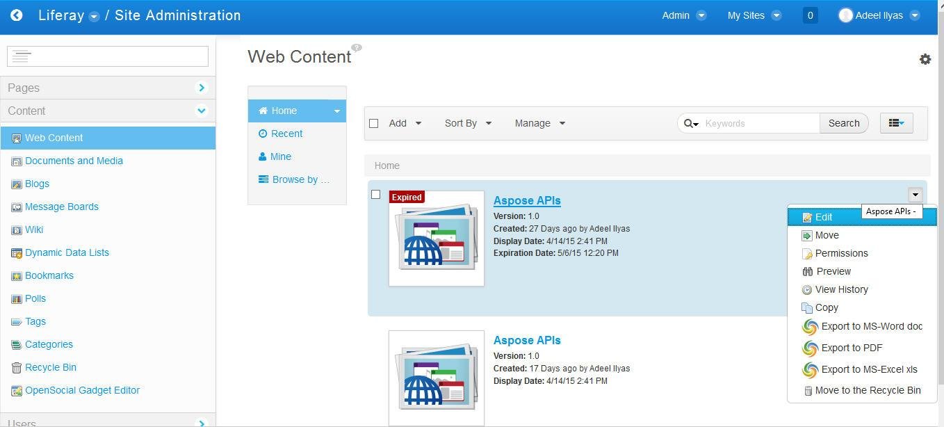 Aspose.Total Java for Liferay (hook plugin app) provides options for exporting web-contents and blogs created in html to MS-WORD, MS-EXCEL and PDF file formats using Aspose.Total Java APIs. (Aspose.Words, Aspose.Cells and Aspose.PDF)