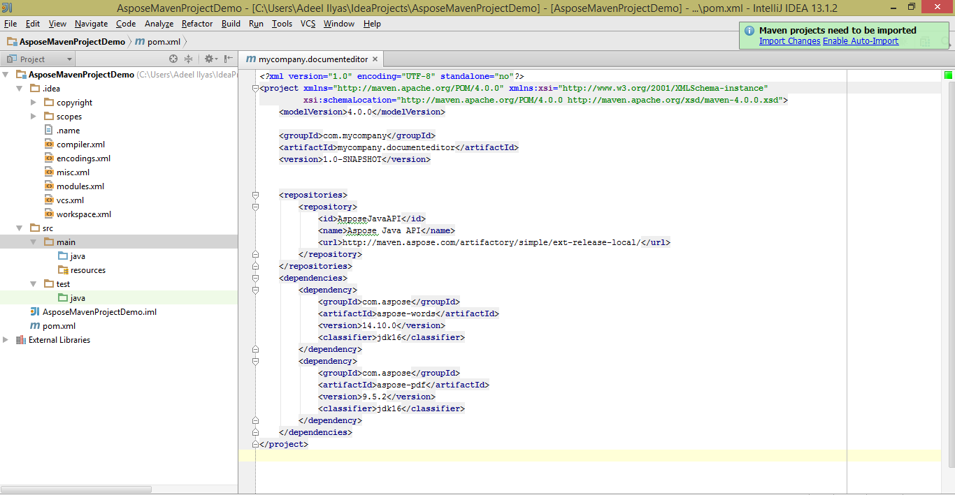 - New created maven project is ready to debug/evaluate, all aspose apis maven dependency references are automatically added.