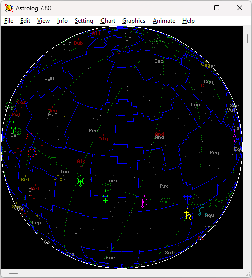 - Display wheels, aspect/midpoint, local horizon, rising/setting, astrocartography, etc.