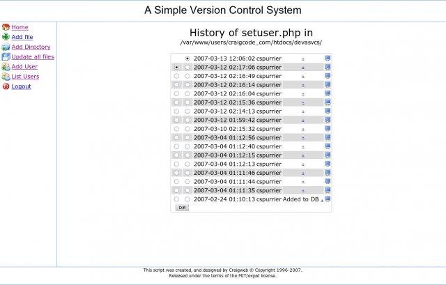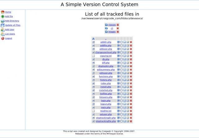 A Simple Version Control System is an easy to install and use version control system. It is written entirely in PHP and stores data in a SQL database. ASVCS is a great choice for those who not need or want the complexity of most version control systems.