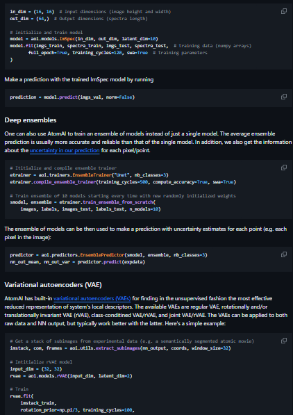 AtomAI is a Pytorch-based package for deep and machine-learning analysis of microscopy data that doesn't require any advanced knowledge of Python or machine learning. The intended audience is domain scientists with a basic understanding of how to use NumPy and Matplotlib. It was developed by Maxim Ziatdinov at Oak Ridge National Lab. The purpose of the AtomAI is to provide an environment that bridges the instrument-specific libraries and general physical analysis by enabling the seamless deployment of machine learning algorithms including deep convolutional neural networks, invariant variational autoencoders, and decomposition/unmixing techniques for image and hyperspectral data analysis. Ultimately, it aims to combine the power and flexibility of the PyTorch deep learning framework and the simplicity and intuitive nature of packages such as scikit-learn, with a focus on scientific data.