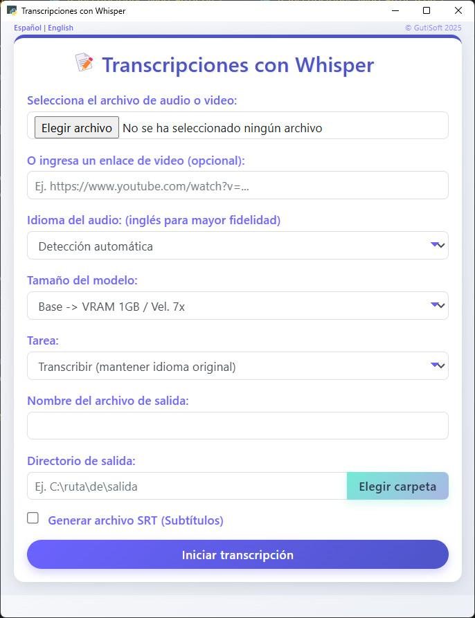 Esta aplicación de escritorio basada en web permite transcribir (o transcribir y traducir al ingles), archivos de audio o video utilizando el modelo Whisper de OpenAI.