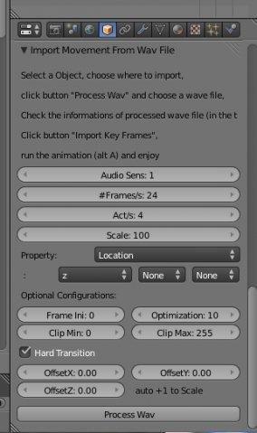Python Script to process a wave file and transform to movement (key frames) on Blender 2.5. Input: sound file (.wav) Output: Key frames direct into the selected object Work to meshes and bones (location, scale or rotation in any axis)