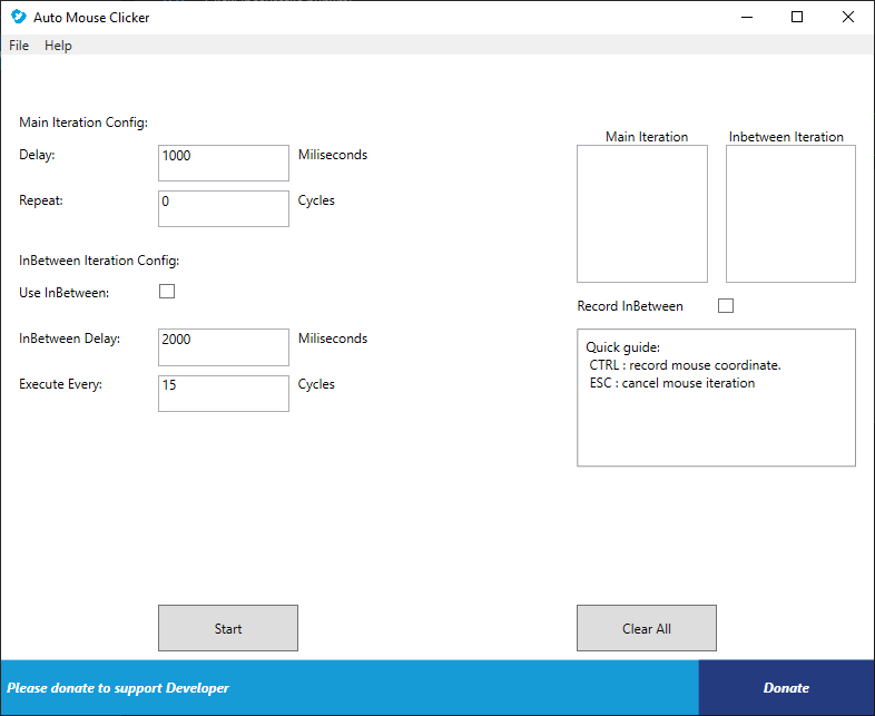 A free windows software to automate mouse click routine. With this software, you can record mouse coordinates in your screen and then simulate mouse click on those coordinates. You can repeat that iteration cycle as much as You want. You can configure the delay how long until next click in milliseconds. Don't want to record mouse coordinates every time you want to run this routine? worry not. You can save the mouse coordinates and easily load it again when you want to use it. And the last feature is InBetween iteration. With this feature, You can set one different iteration that automatically run every sets of cycle.
