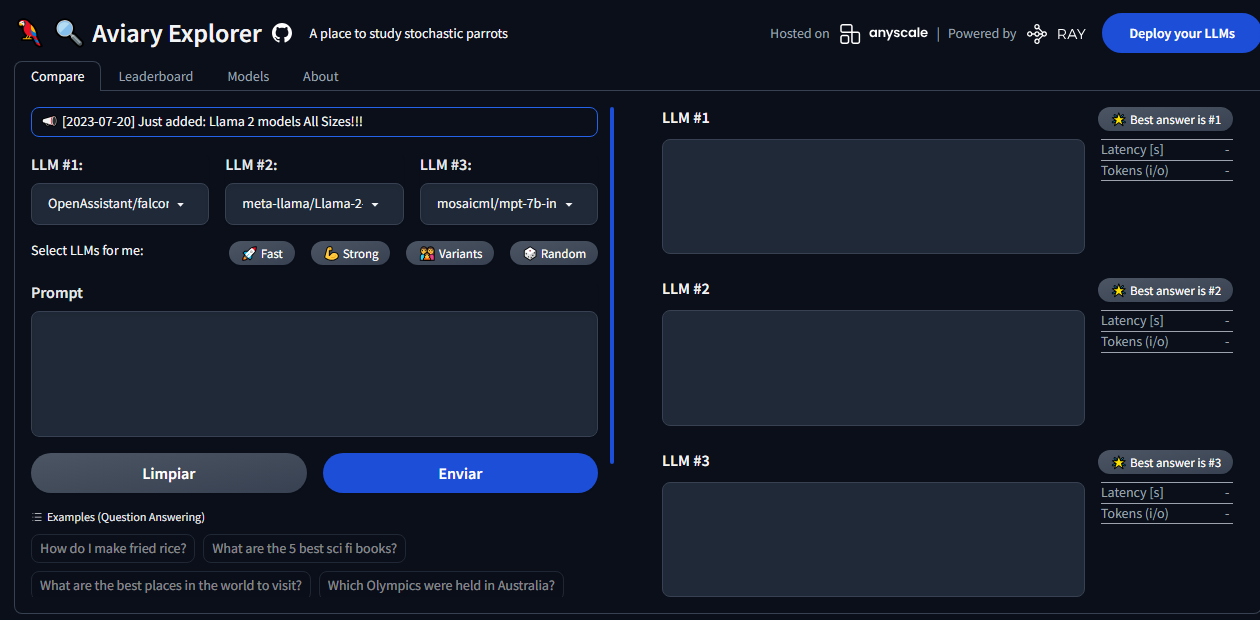 Aviary is an LLM serving solution that makes it easy to deploy and manage a variety of open source LLMs. Providing an extensive suite of pre-configured open source LLMs, with defaults that work out of the box. Supporting Transformer models hosted on Hugging Face Hub or present on local disk. Aviary has native support for autoscaling and multi-node deployments thanks to Ray and Ray Serve. Aviary can scale to zero and create new model replicas (each composed of multiple GPU workers) in response to demand. Ray ensures that the orchestration and resource management is handled automatically. Aviary is able to support hundreds of replicas and clusters of hundreds of nodes, deployed either in the cloud or on-prem.