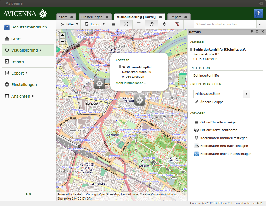 Avicenna is an application for visualizing location data stored in excel or .csv table files on a map or in a table view. It provides several export functions (such as single pictures, database dumps and even a HTML-export that enables you to use Avicenna on your website).