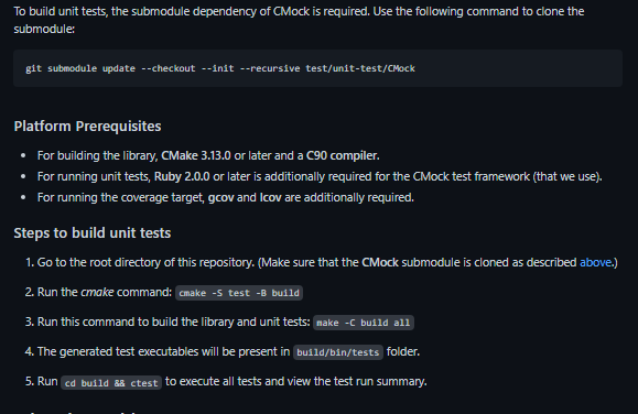 - To build unit tests, the submodule dependency of CMock is required