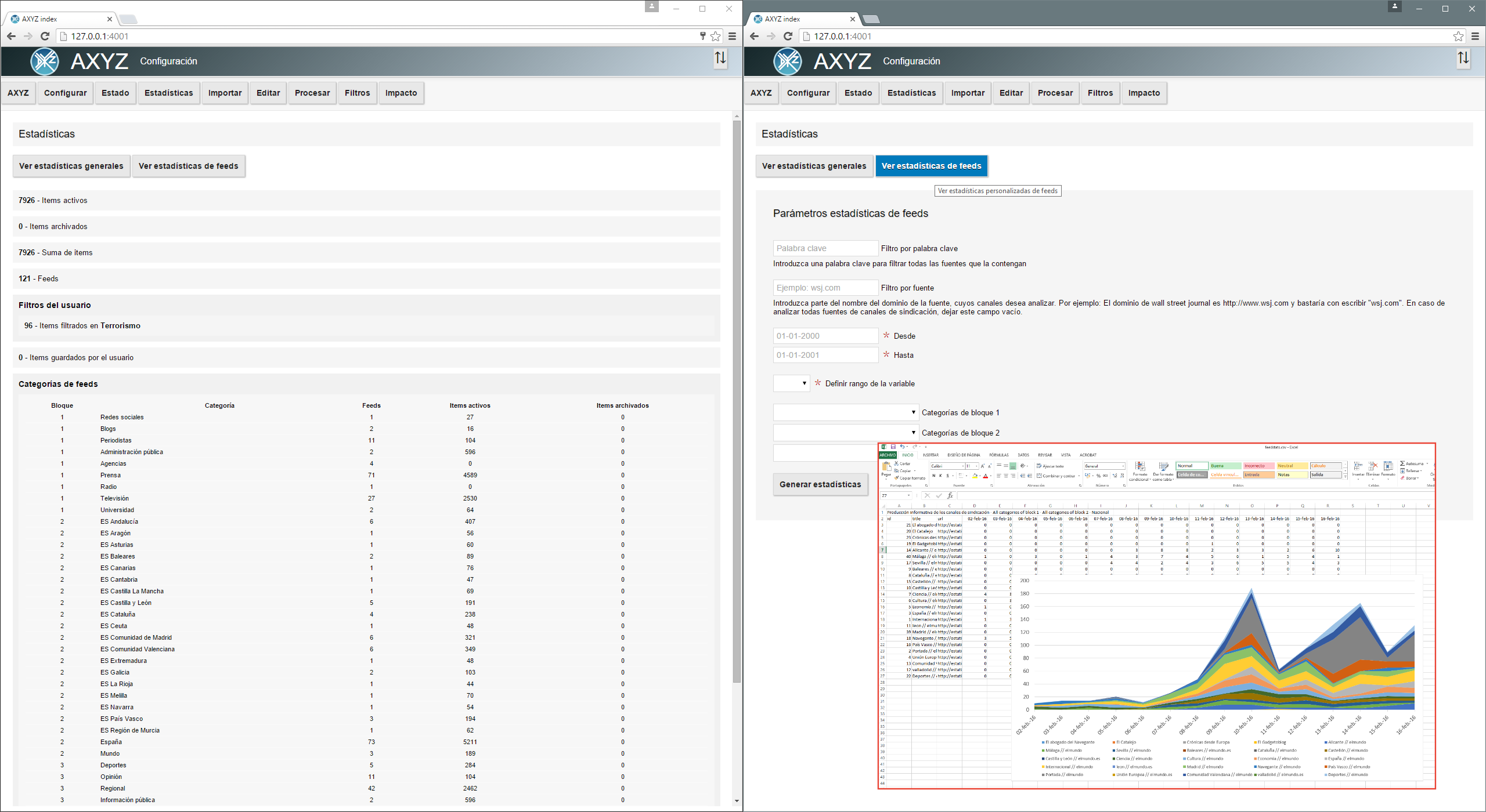 The article explains the design and the characteristics of a new open source content aggregation system. Among the features of the program, stands out a new processing engine of syndication channels, monitoring capability of information recovery in real time, the possibilities of the configuration of aggregator behavior, automatic classification of contents and new models for representation of information from relational interactive maps. On the other hand, the aggregation program, which named AXYZ, is designed to manage thousands of syndication channels of RSS format. Furthermore it also provides statistics that can be used to study the production of any producer subject and the impact of the information that published in other sources. The result that has been obtained in the research, allow to create modules capable of compare the relationship between different news or information from different sources, their degree of influence and their detection by the patterns.